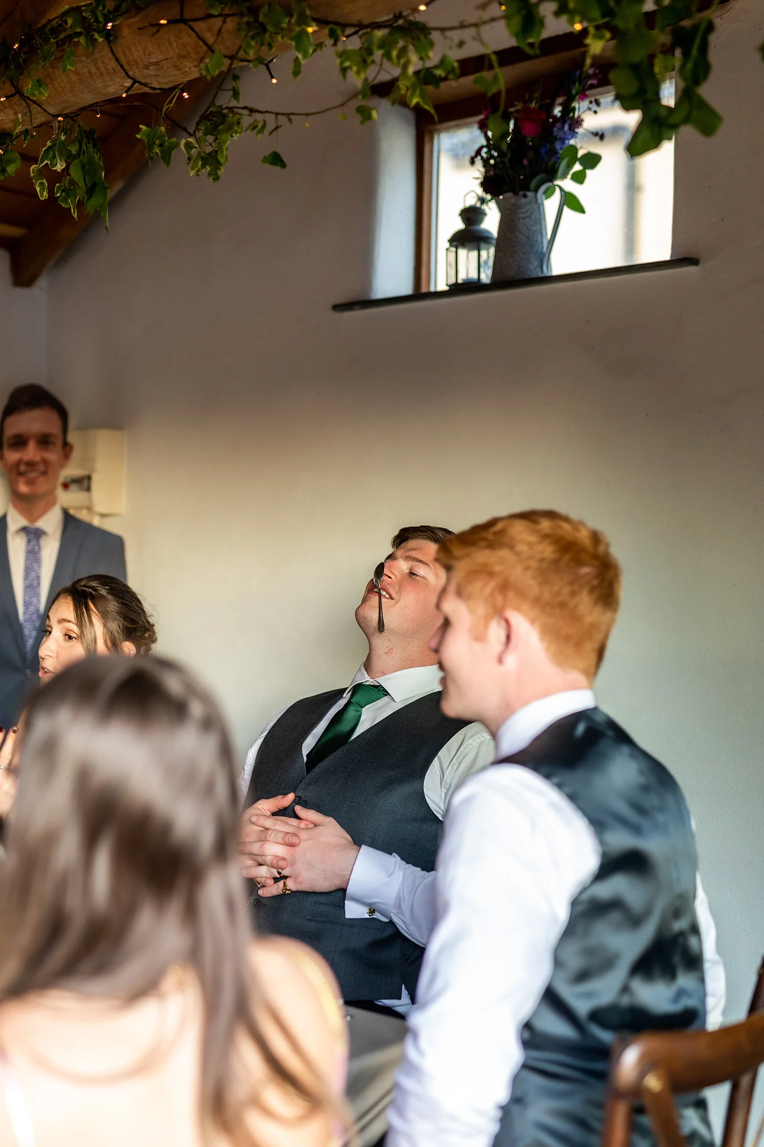 Once everyone was ready, we made our way over to Batemans Barn for their ceremony, which was being live streamed to the close friends and families that hadn’t been able to attend the wedding. The couple said their vows in an emotional and personal ceremony, before we headed outside for the big group photo Claire and Tom had been preparing for. As everybody got in place expectantly, Tom and Claire announced their pregnancy – and their guests’ shocked faces were captured on camera forever.