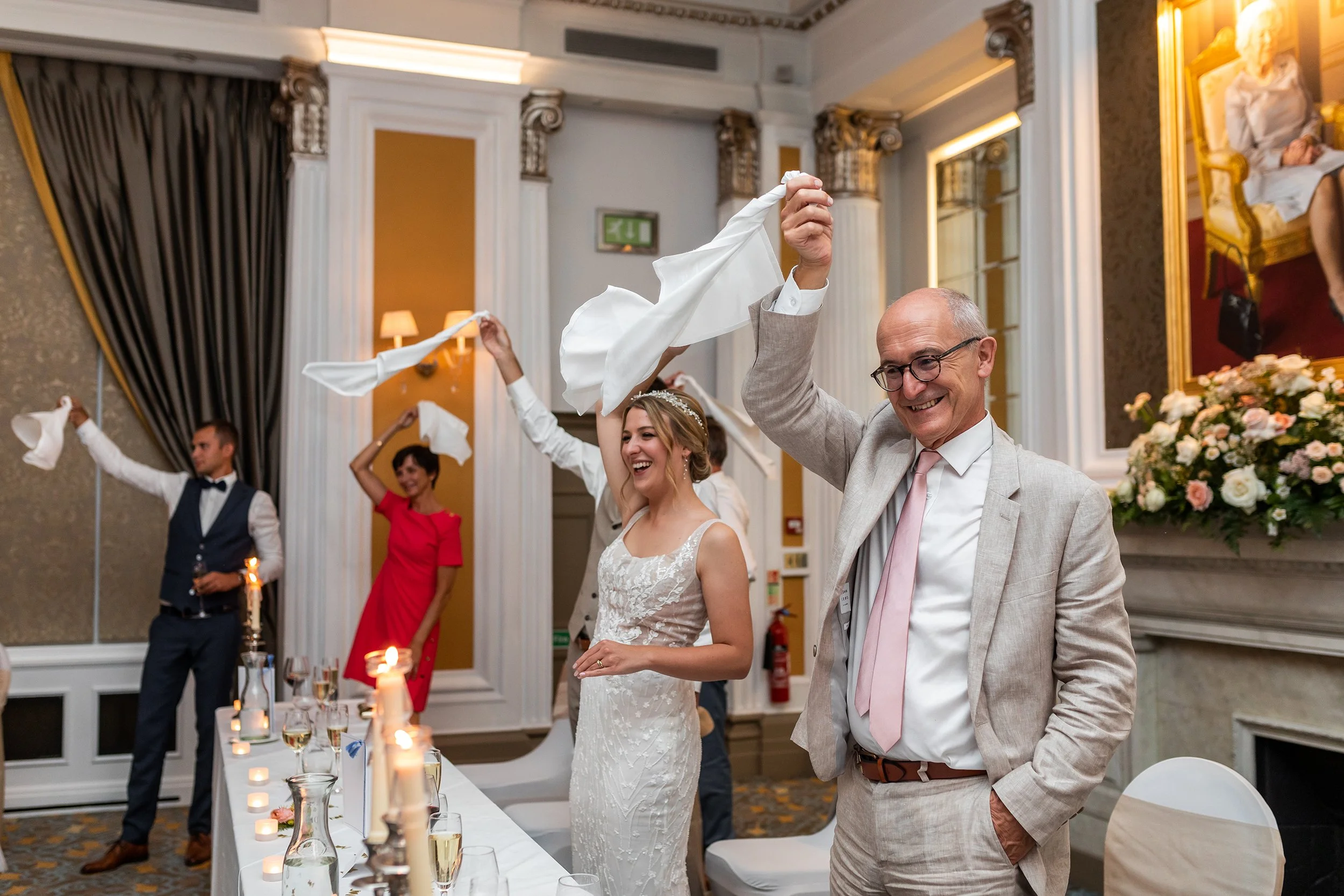 From the chapel, we enjoyed a trip through central London on a traditional routemaster bus, before arriving at The Royal Air Force Club, just a stone’s throw from Buckingham Palace. They enjoyed drinks and canapes in the Churchill bar, then made their way upstairs to The Sovereigns’ Room for a four-course meal, speeches and cake cutting. Back downstairs, it was time for the couple’s first dance, and from that point onward the dancefloor was full.